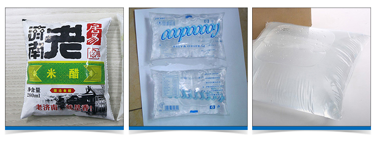 Sachet liquid filling and sealing machine is applicable for packing liquid like milk, soy sauce, vinegar, rice wine and various liquids. Packaging Material: Heat-sealable plastic film, such as polyethylene/PE.